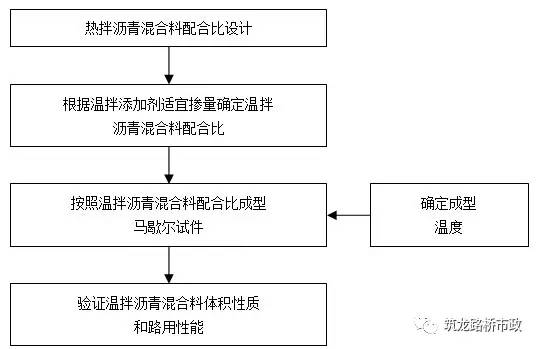 溫拌瀝青混合料的生產(chǎn)配合比設計與熱拌瀝青混合料的設計方法基本一致,只是溫拌瀝青混合料室內(nèi)成型溫度不同(比熱拌瀝青混合料低20-25℃),溫拌瀝青混合料配合比設計過程見下圖。溫拌添加劑摻量很小,故理論密度計算時可不考慮其影響。